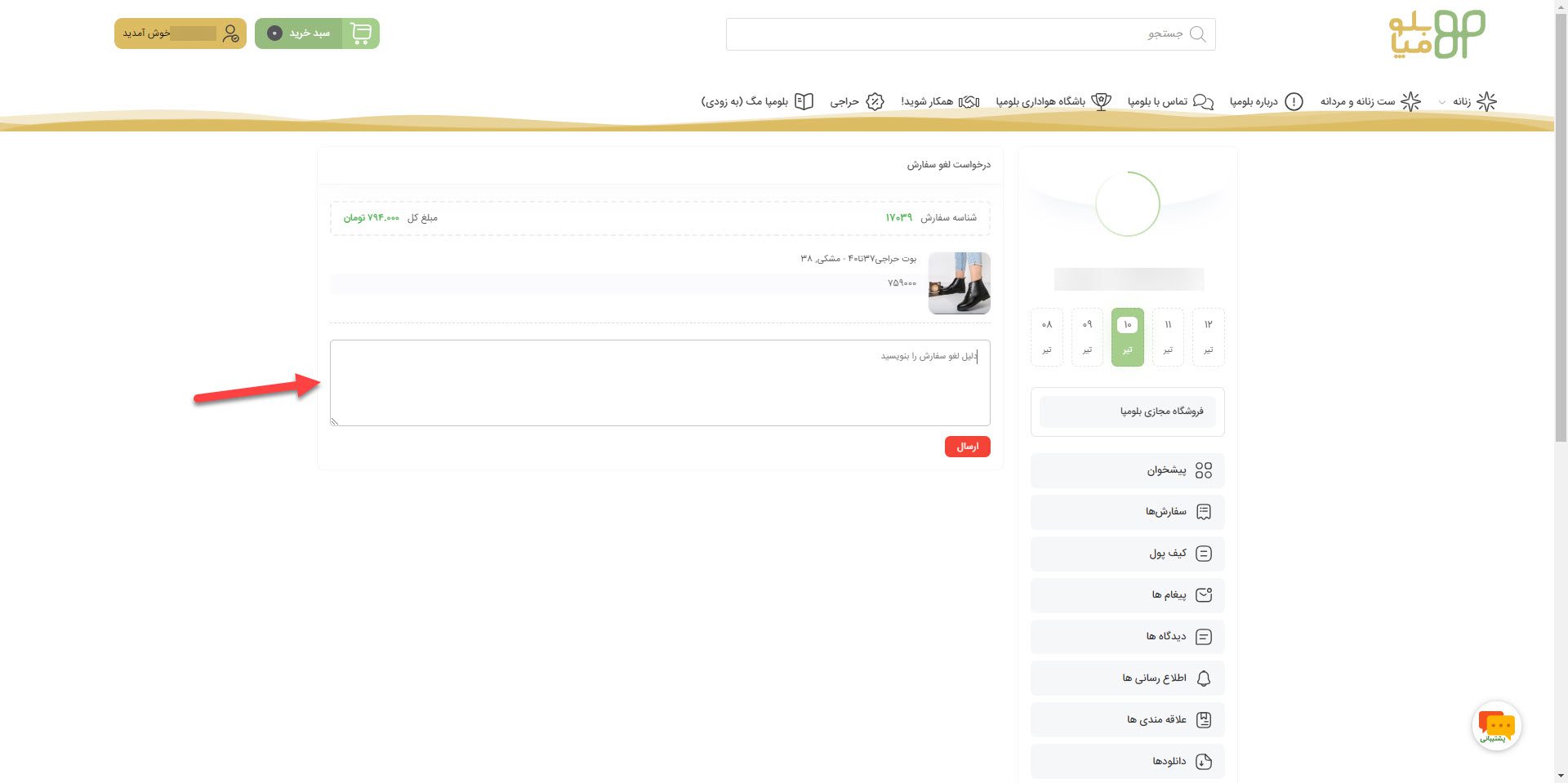 5) در صفحه باز شده محصولات موجود در سفارش خود را مشاهده خواهید کرد. در صورت تایید محصولات، در فیلد مشخص شده دلیل خود را برای لغو سفارش نوشته و روی دکمه “ارسال” کلیک کنید.