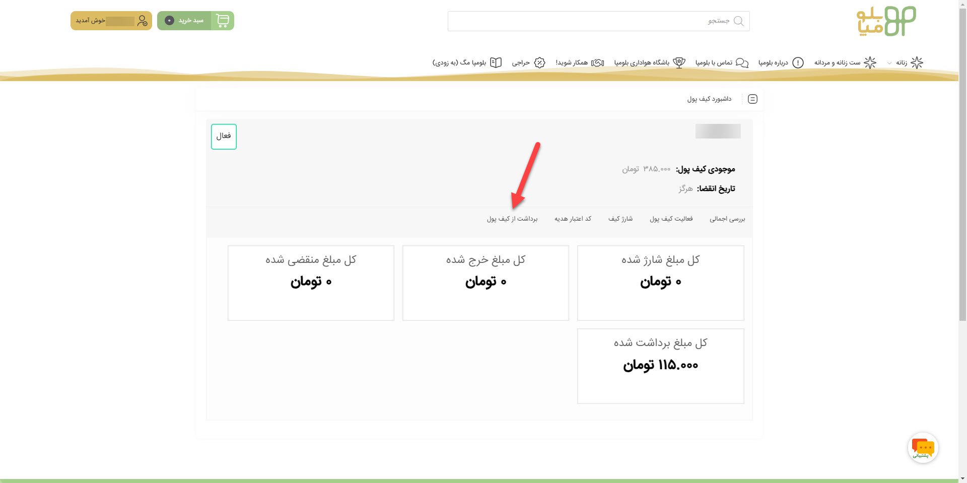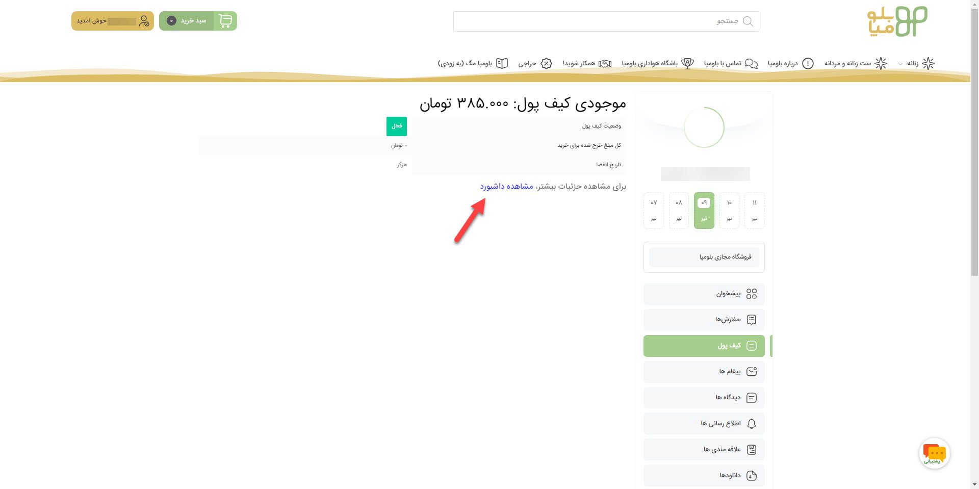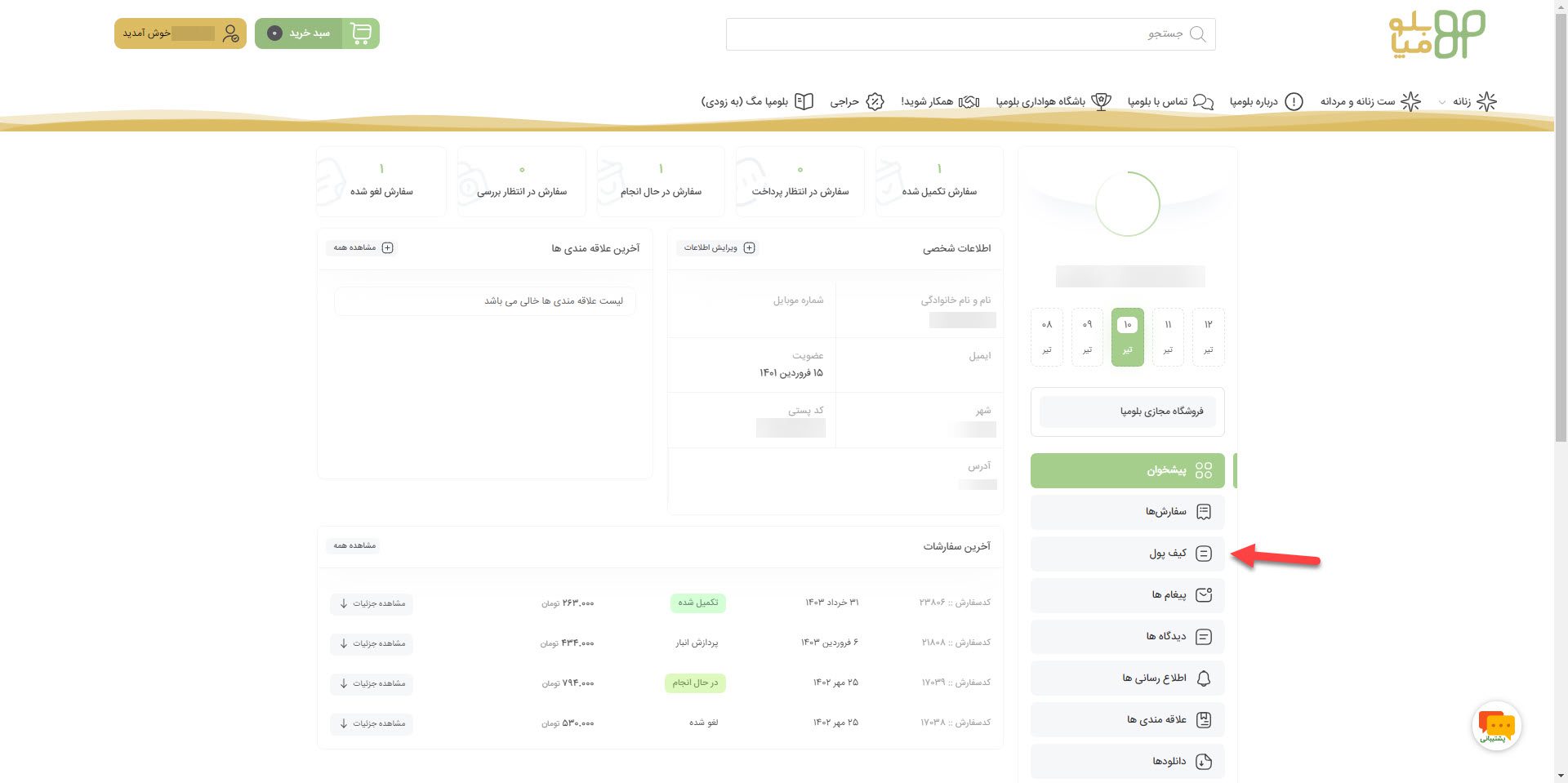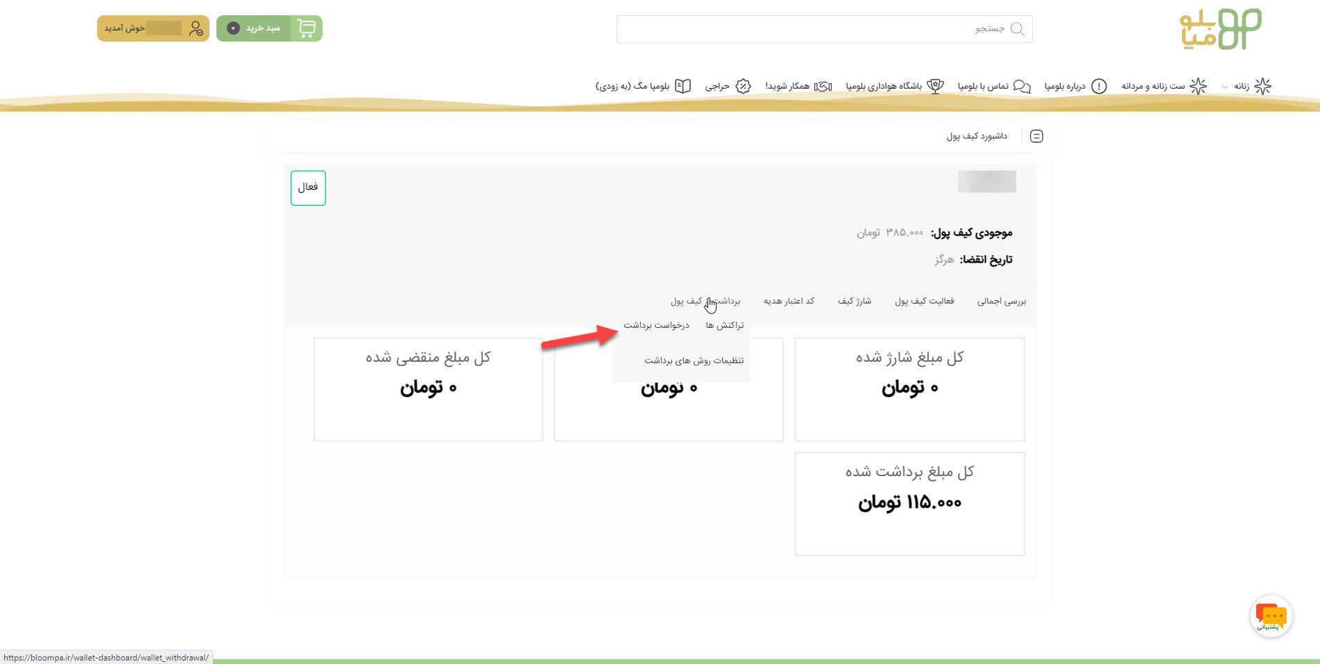 3) از منوی کناری صفحه کاربریتان روی دکمه “کیف پول” کلیک کنید.